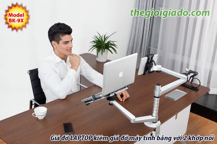 - Model BK-9S là model cho phép đỡ đồng thời LAPTOP (cánh tay có 2 khuỷu) và MÁY TÍNH BẢNG (cánh tay có 2 khuỷu).